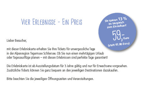 Mit dieser Erlebniskarte erhalten Sie Ihre Tickets für unvergessliche Tage in der Alpenregion Tegernsee Schliersee.