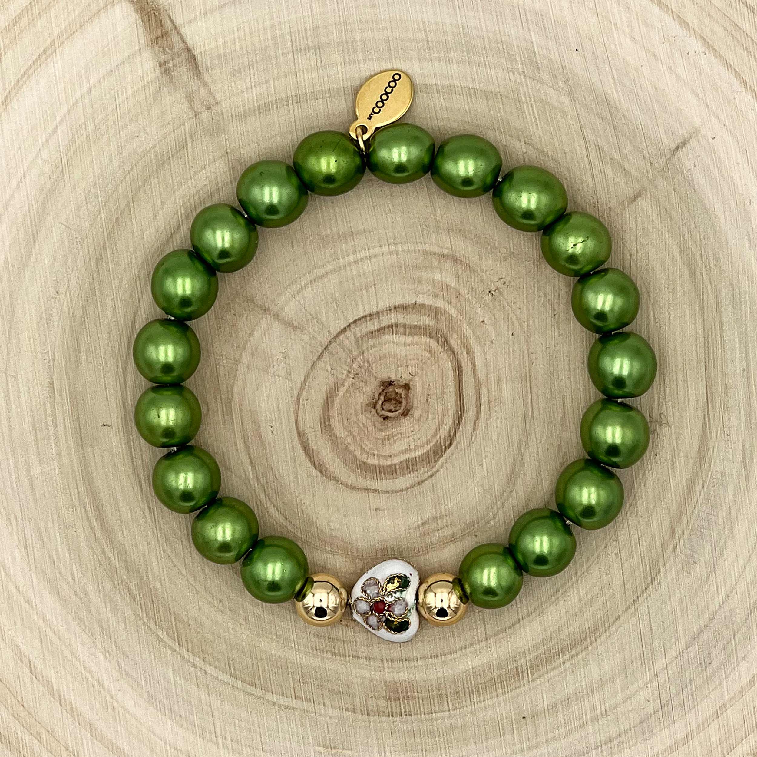 Dieses einzigartige Homatbandl mit großen grünen Glasperlen, einem Emailleherz und glänzenden Goldperlen ist der perfekte Begleiter für deinen modernen Look. Zeige Stil und Herz, egal wo du unterwegs bist.